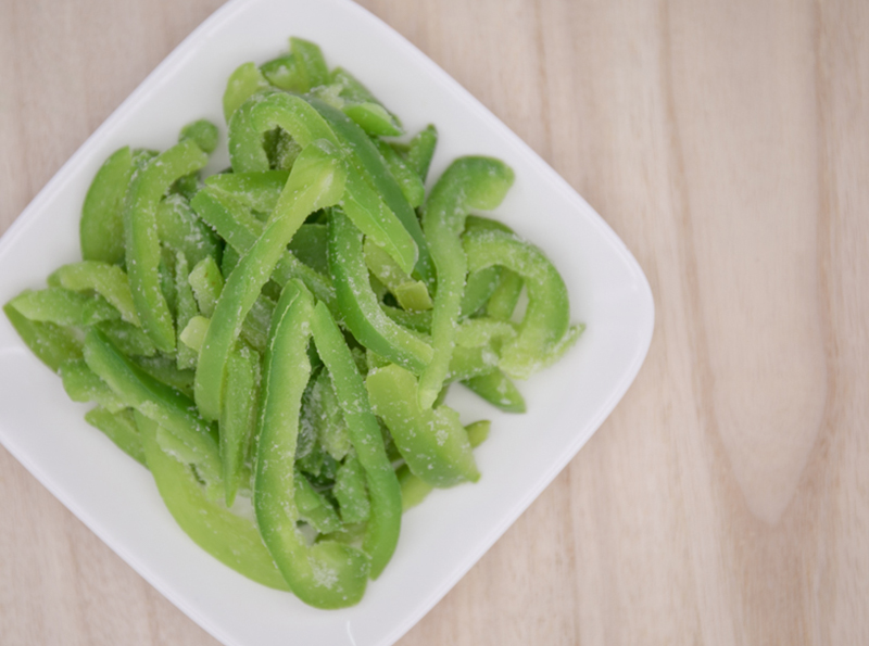 原料検収 ⇒ 洗浄 ⇒ 種・筋除去 ⇒ 選別 ⇒ 洗浄 ⇒ カット ⇒ 選別 ⇒ ブランチング(98~100℃ 20秒) ⇒ 冷却 ⇒ 選別 ⇒ 水切り ⇒ 急速冷凍 ⇒ 仮包装 ⇒ 選別 ⇒ 計量 ⇒ 封口 ⇒ 検査 ⇒ 金属探知機(Fe:1.5mm、Sus:2.0mm) ⇒ 梱包 ⇒ 計量・検品 ⇒ -18℃以下保管