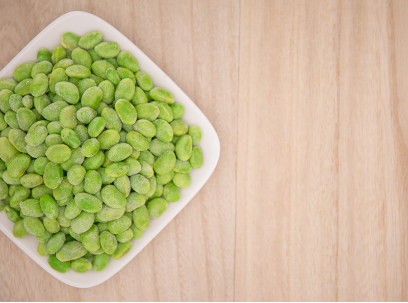 原料検収 → 選別・等級分け → 洗浄 → 予蒸煮(98℃、30秒) → 莢むき → 選別 → 洗浄 → 蒸煮(96~100℃、100秒) → 冷却 → 急速冷凍 → 選別 → 計量・包装・封口 → 金属探知機(Fe:φ1.5㎜、Sus:φ2.0㎜) → X線検査機(Fe:φ0.7㎜、Sus:φ2.0㎜、ガラス:φ2.0㎜、PVC:φ2.0㎜) → 計量 → 梱包 →入庫保管 → 出荷
